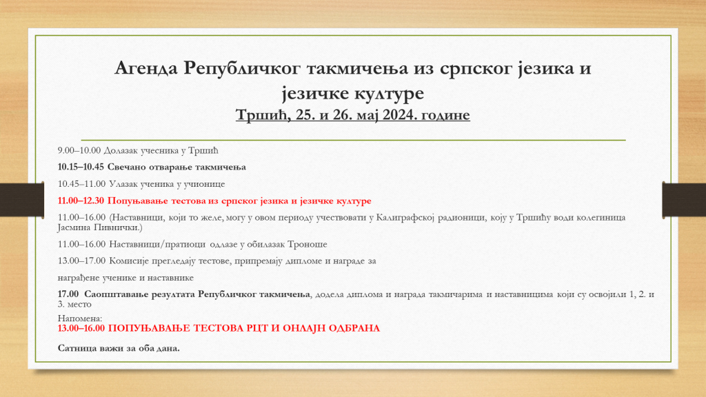 Републичко такмичење из српског језика и језичке културе Агенда Републичког такмичења из српског језика и језичке културе Тршић, 25. и 26. мај 2024. године 16. мај 2024. admin