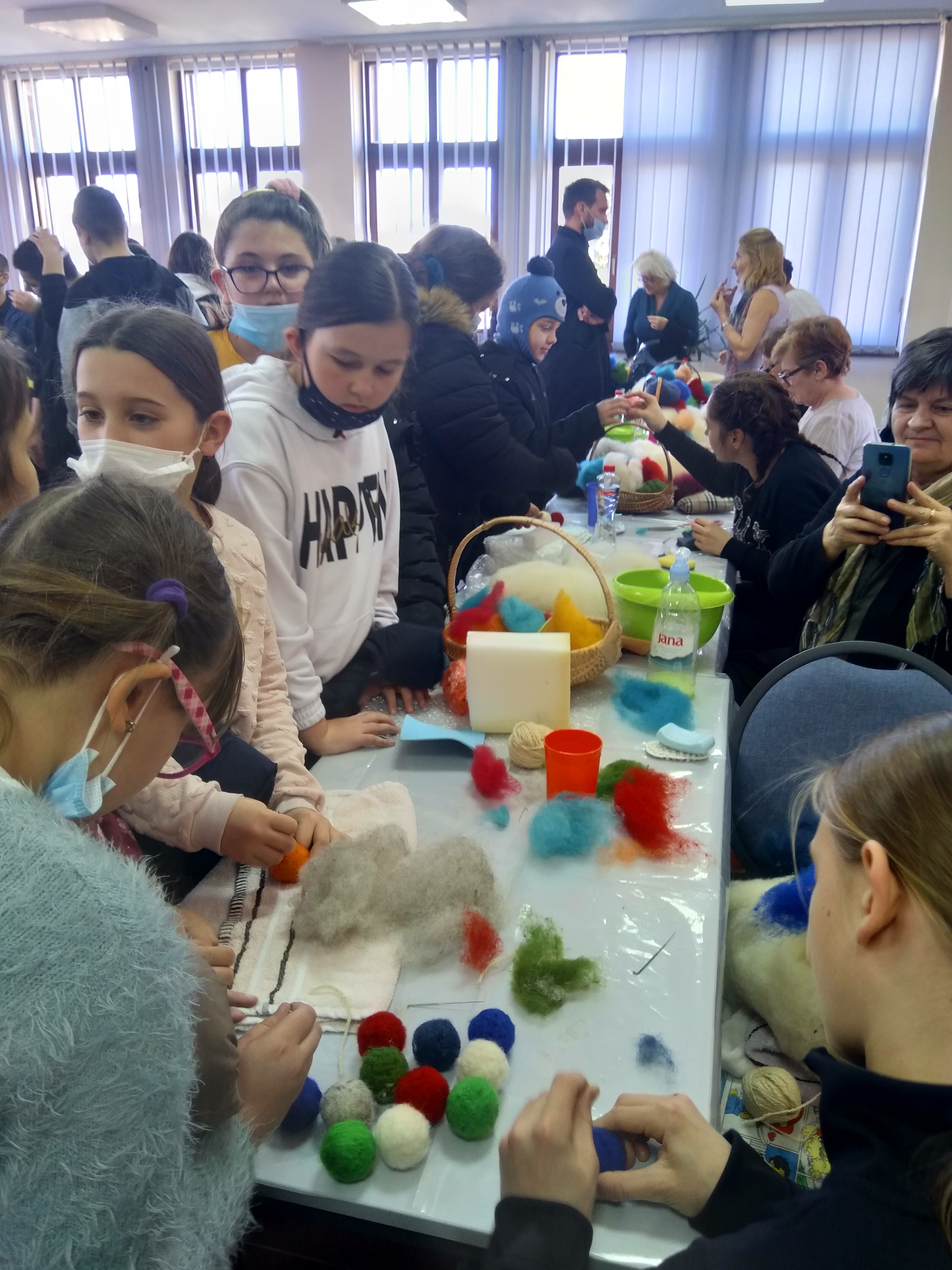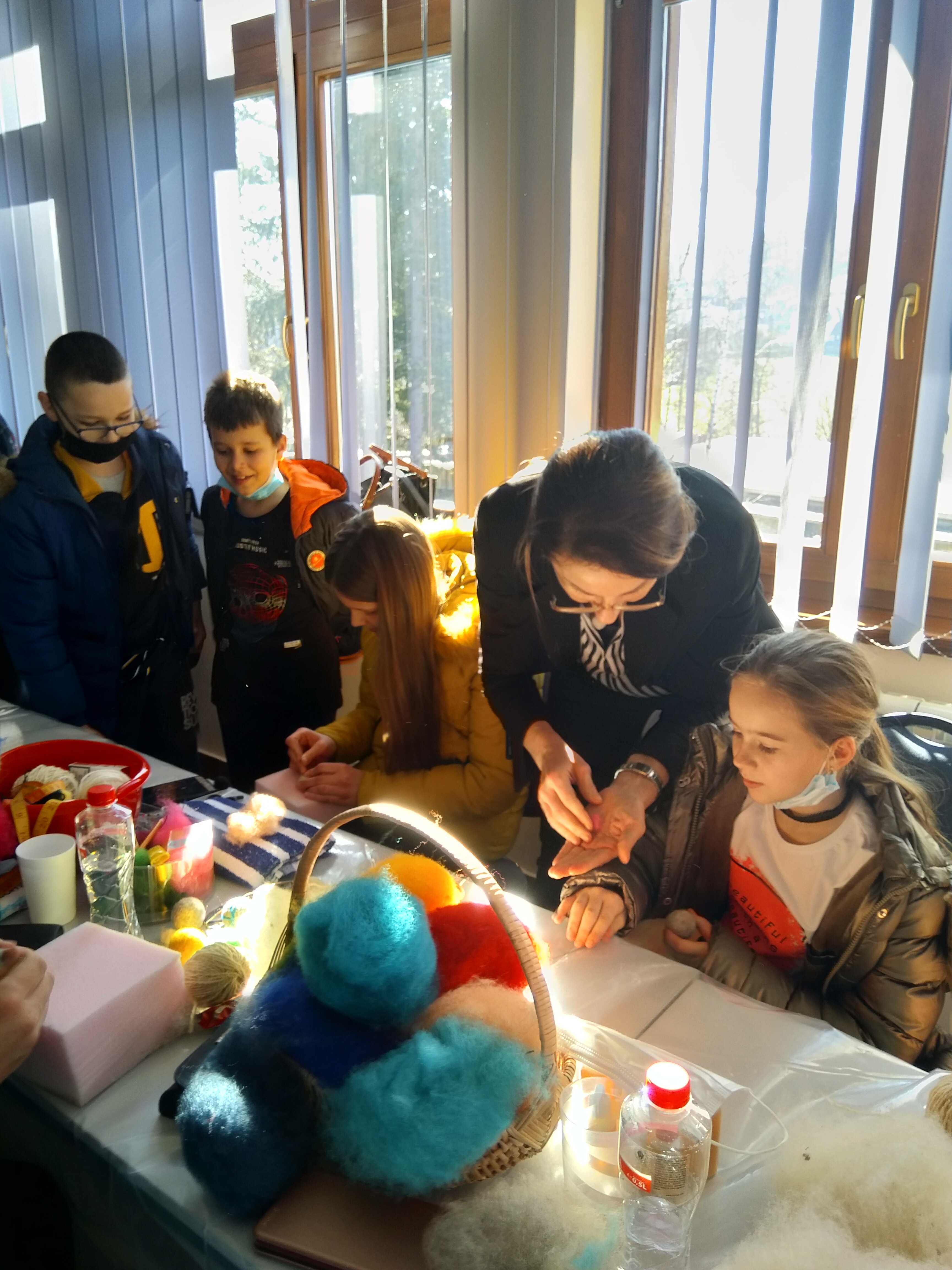 Ученици, наставница Марија Поповић , вероучитељ и учитељица Снежана Павловић су посетили ову радионицу и сами се опробали у филцању вуне.