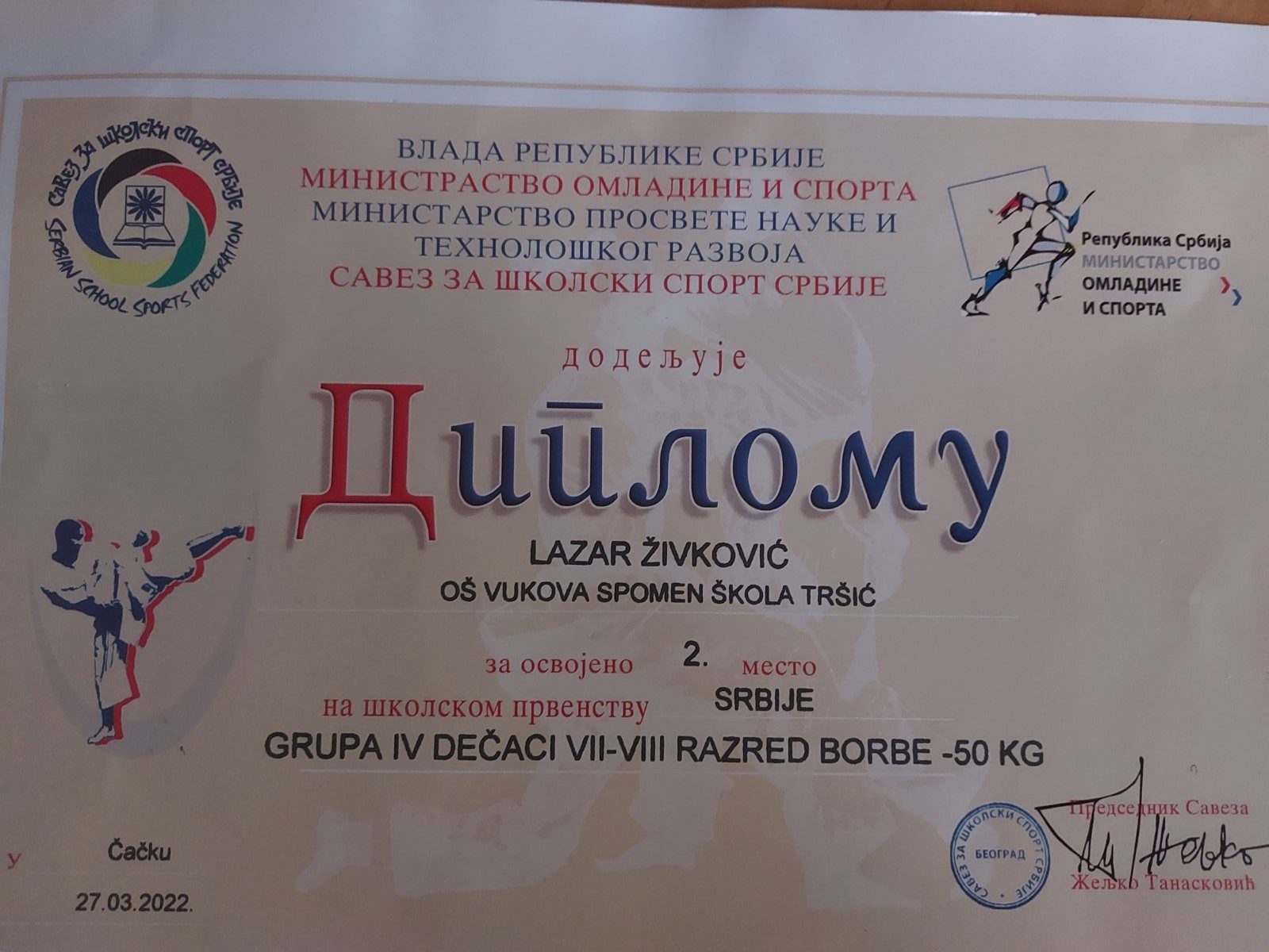 Лазар Живковић 2.место VII-VIII разред борбе -50кг